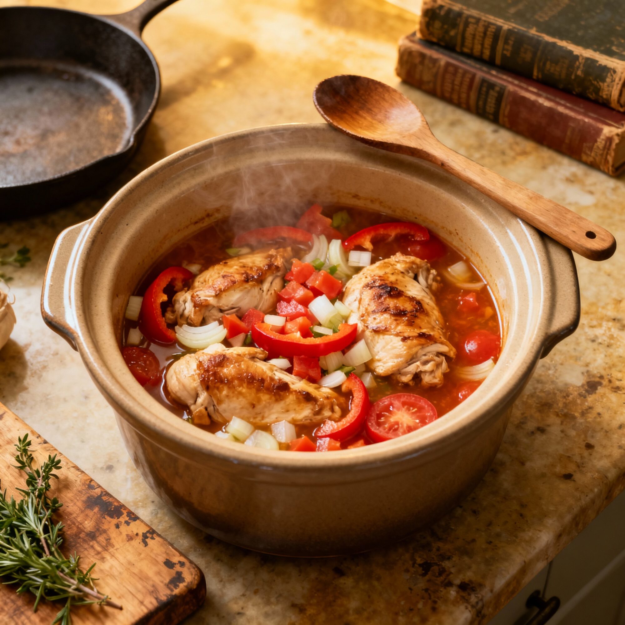 Malse slowcooker-stoof van kipdij met paprika, ui, knoflook en tomaat.