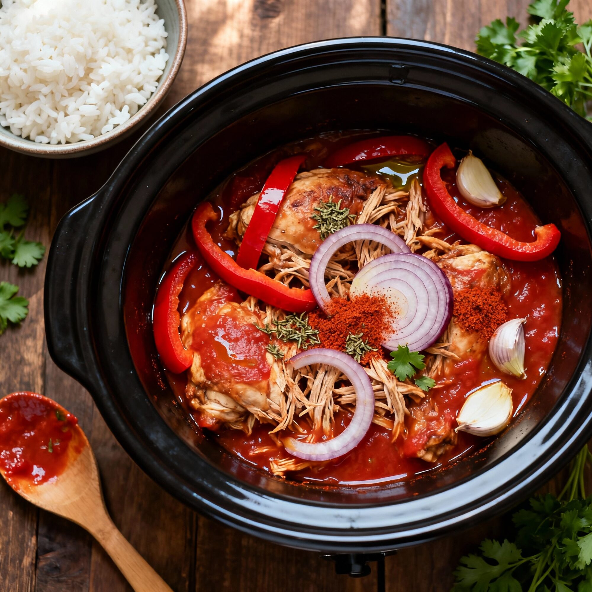 Doe ui en knoflook op de bodem van de slowcooker, leg de kippendijen erop. Meng tomatenblokjes met tomatenpuree, komijn, gerookt paprikapoeder en zout, en giet over de kip.